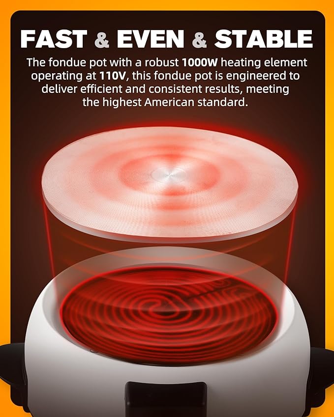 - Fast & Consistent Heating – Equipped with a powerful 1000W heating element, this fondue pot quickly reaches the desired temperature, delivering steady heat and optimal performance for any type of fondue, from classic oil to sweet chocolate and rich cheese.