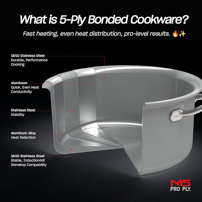 - 5-LAYER BONDED CONSTRUCTION: Delivers fast, even heating with no hot spots—so your food cooks more evenly every time. Made with premium 18/10 stainless steel and a 3-layer aluminum core for long-lasting performance. The 2.5mm thick body retains heat better and resists warping, even under high heat.