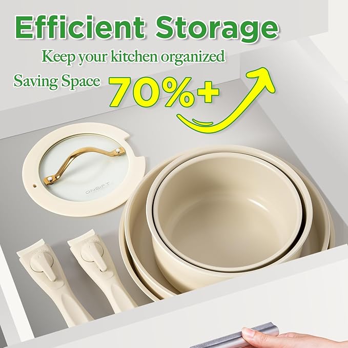 - Space Saving: ONGIFT stackable pots and pans set with detachable handles keep the kitchen organized and tidy, saving 70% of space, storage is simple. Perfect for kitchen and an ideal choice for RVs or campers