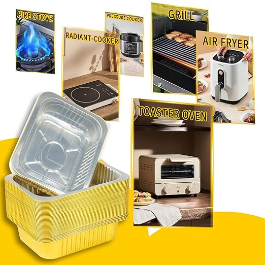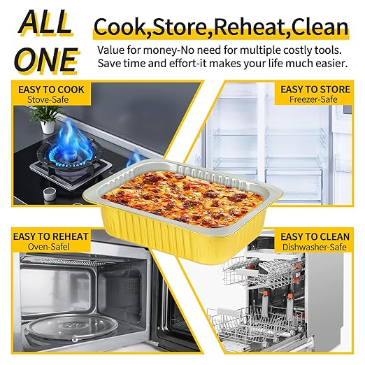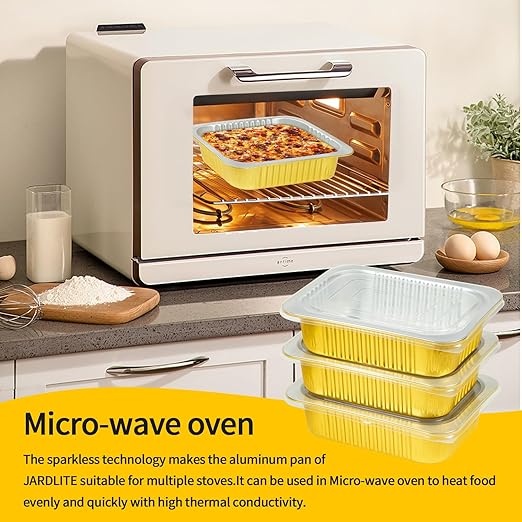- 【Safety & Time Saving】JARDLITE gold aluminum foil pan is made of high quality aluminum material, which is 2 times harder than other silver aluminum foil pans, lightweight and sturdy, not easy to deform, high temperature resistant, and can withstand oven temperatures up to 600°F. Food grade plastic cover. Does not contain harmful substances, healthy and safe. Use these takeout containers to pack food and do all the work, saving you time!