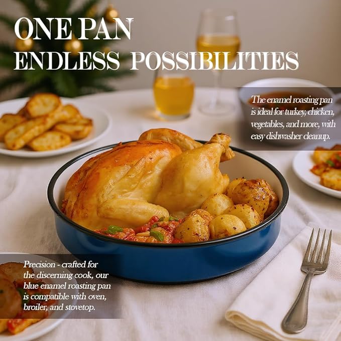 - Strong durability: The roaster pan adopts a high-end granite pattern appearance, which is not only beautiful and generous, but also can maintain its integrity for many years, The sturdy enamel steel design ensures the durability of the roasting pan