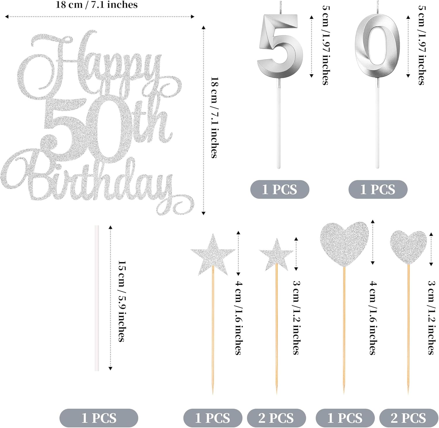 - Package content: you will receive 1 piece happy 50th birthday topper, 3 pieces star cake toppers, 3 pieces heart cake toppers and 2 pieces numeral candles, it's a great addition to the 50th birthday party and anniversary party