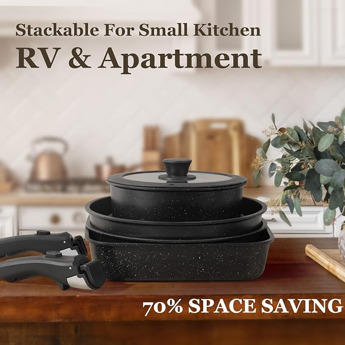 - γπΏπππΌπΎππΌπ½ππ ππΌππΏππ πππ ππΌππ πππππΌππγThese pots and pans set with detachable handles allow for compact storage, sapce saving 70% for kitchen cabinet or organized in drawer, especially great for RV or small apartment. the reinforced removable handles can support up to 24 pounds, ensuring a secure grip and enhancing your cooking experience without the worry of breaking.