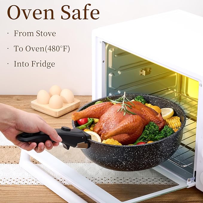 - Oven Safe: The cookware set is oven-safe up to 480°F, making it suitable for baking, roasting, and grilling. It is also suitable for use on gas stoves, electric stoves, and induction stoves. Please remove the handle from pots and pans set when heating.