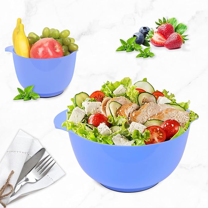 - 【Anti-Slip & Practical】There is non-slip rubber at the bottom of the plastic bowl, it can prevent slipping efficiently during the mixing. And compared with traditional mixing bowls, they are resistant to impact and lightweight enough, you will not worry about the smash, rust, or too heavy to handle at all. Versatile in use, not only does it can used as stacking mixing bowls, double as convenient containers as fruit bowl, salad bowl, batter bowl, cereal bowl or even as popcorn bowl.