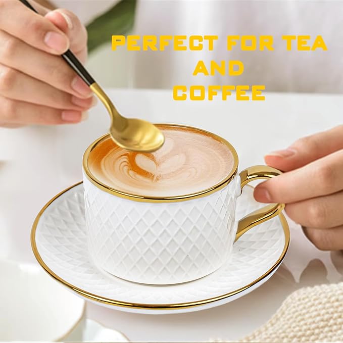 - Espresso Cups and Saucers Set of 6: Our stackable coffee cups set consists of 6 coffee cup and 6 saucers. The traditional coffee cup shape is paired with a unique plaid embossing, and the edge is embellished with gold to make the cup more delicate and suitable for your daily use in the home or office.