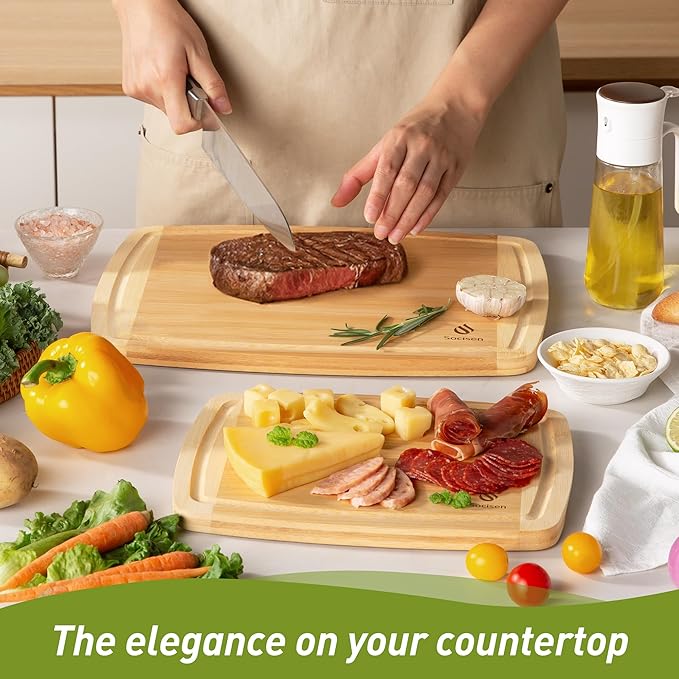 - Knife-Safe Surface for Edge Preservation: Our bamboo cutting board features a durable and thick surface. Meticulously polished to be ultra-smooth and flat, it has no burrs, cracks, or splinters. The cutting board is gentle on knives, reducing dulling and blade damage. Whether using a serrated knife for bread or a chef's knife for vegetables, the wood cutting board prevents blades from dulling quickly, saving you time on sharpening and allowing more time for enjoying your cooking.