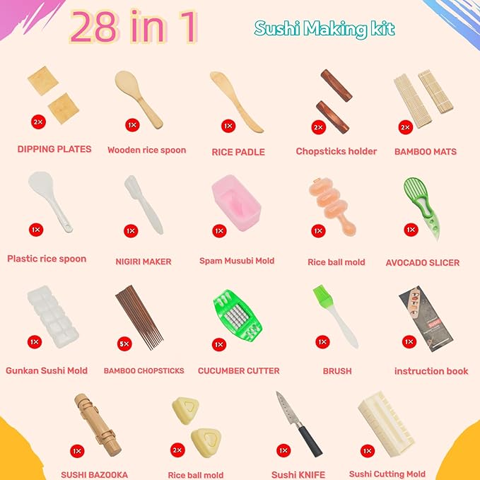 Sushi Making Kit, 28 in 1 Sushi Making Set for Beginner &Pros, with Bamboo Sushi Mats, Sushi Bazooka, Onigiri Mold, Rice Paddle, Sushi Knife, Sushi ball maker, cucumber slicer & More