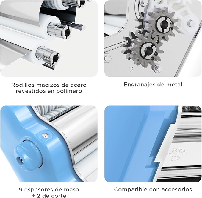 PASTALINDA Classic 200 Pasta Maker Machine, 20 cm Wide Rollers, 9 Thickness Positions, 2 Cutting Positions, Stainless Steel. Includes Reinforced Hand Crank And Two Clamps