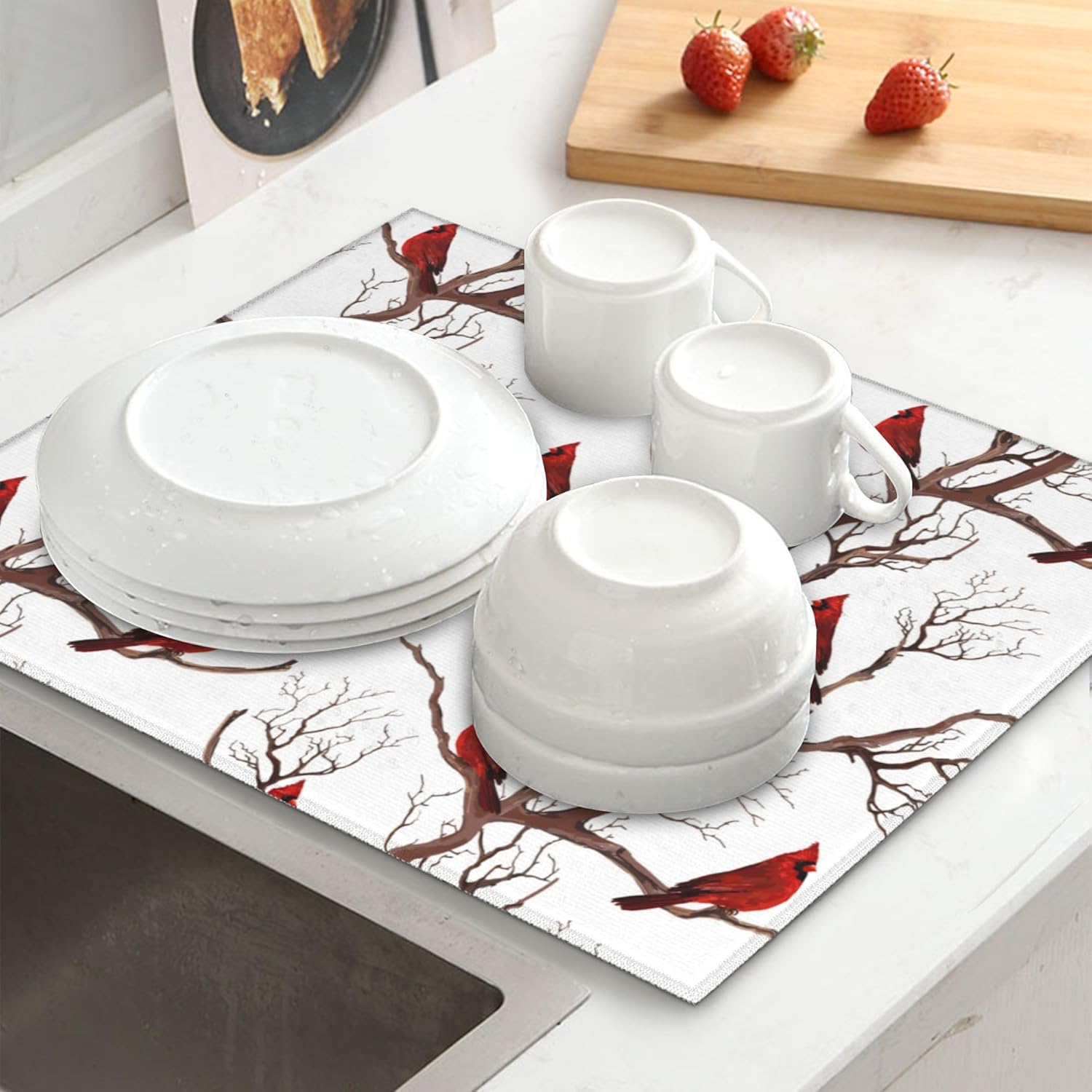 Winter Cardinal Birds Dish Drying Mat for Kitchen Counter Washable Absorbent Drying Mat Reversible Microfiber Drying Pad Home Holiday Decor Kitchen Accessories 16"x18"