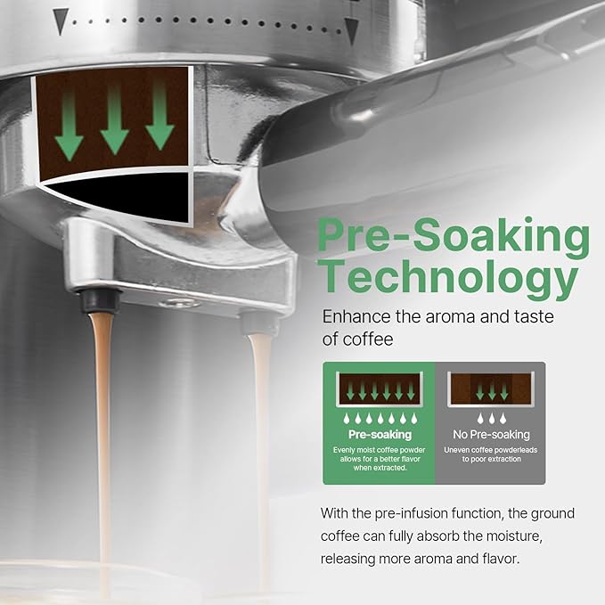 - 20 Bar Professional High Pressure & Dual Heating System: Our coffee maker is equipped with 20 bar pump for espresso extraction and 4 bar pump for the milk frothing, creating the golden crema of espresso and rich milk foam. The 1350W and 900W dual fast heating systems allow the coffee machine to preheat in minutes and control the temperatures of coffee and milk froth separately. Furthermore, our cappuccino machines for home use pre-soaking technology to achieve thorough coffee penetration and enhance the taste of coffee