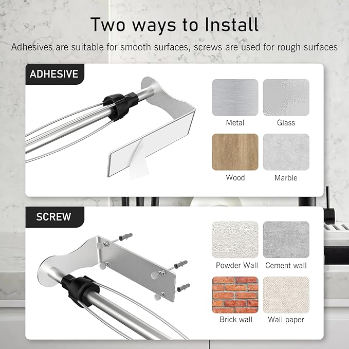 - EASY INSTALLATION: This under cabinet paper towel holder supports two ways of installation, Adhesive or Screw. You can choose the appropriate way according to the condition of the target installation location