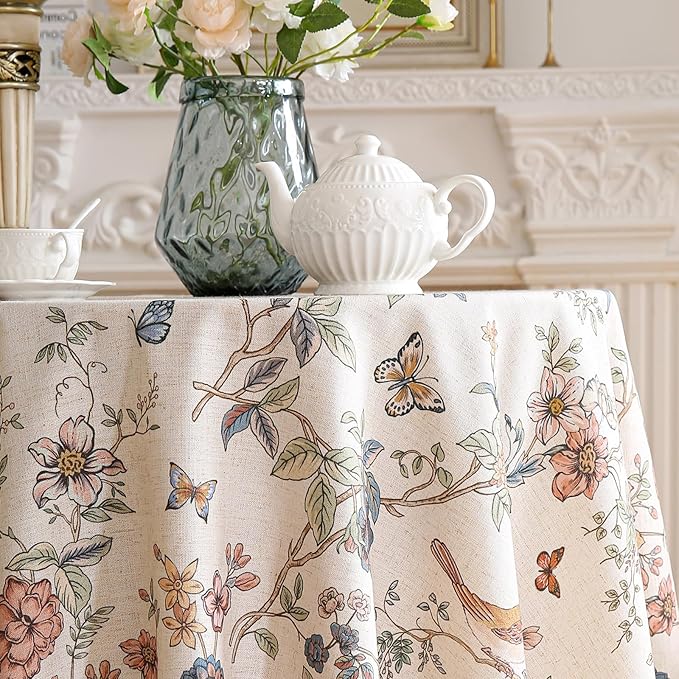 French Tablecloth for Round Tables,Linen Table Cloth with Flowers and Birds Pattern,Heavy Durable Table Cover for Dining Thanksgiving Kitchen Decor Party Christmas,Diameter 67"