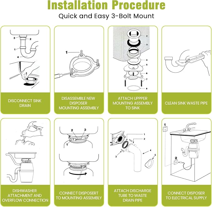- Easy to Install&Maintenance: The 3-bolt mounting system and washer hook simplifies the installation, allowing for secure and stable attachment to the sink and easy replacement of existing dispossesses. Removable components allow for thorough cleaning&easy maintenance. This 3/4HP garbage disposal includes multifunctional sink plug, Splash guard, Sink Flange, Splash guard seal ring, Rubber Gaskets, Lower Mounting Ring, Fiber Gasket, Backup Ring, Drainpipe Gland, Mounting Ring, Rubber Gasket, Screws, Drainpipe, Snap Ring, and Manual