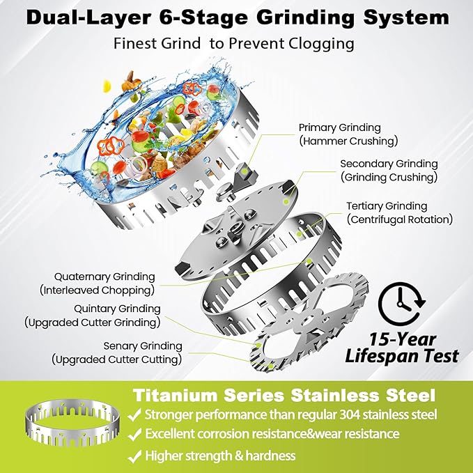 - Dual-Layer 6-Stage Grinding System: This garbage disposal is equipped with a high-torque 3/4 HP 3000 RPM permanent magnet DC motor and an upgraded dual-layer six-stage grinding system. It efficiently and reliably grinds even the toughest food waste (such as fruits, vegetables, and bones) into tiny particles as small as 2mm. The grinding process includes six stages: primary hammering, secondary crushing, centrifugal spinning, interlocking cutting, blade grinding, and final blade chopping. This multi-stage grinding minimizes noise and vibration, ensuring ultra-fine grinding results. With this advanced 6-stage grinding system, you won’t have to worry about clogged drains anymore.