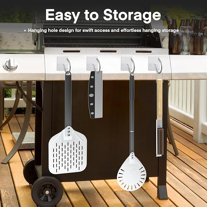 - Durable & Easy to Storage: Two perforated pizza peel and pizza rocker are made of high quality food-grade aluminum. Each tool is designed with a hole for hanging storage. This pizza peel kit is suitable for making pizzas and transfer breads, cakes, biscuits, pastries to ovens, outdoor grills and wood-burning ovens