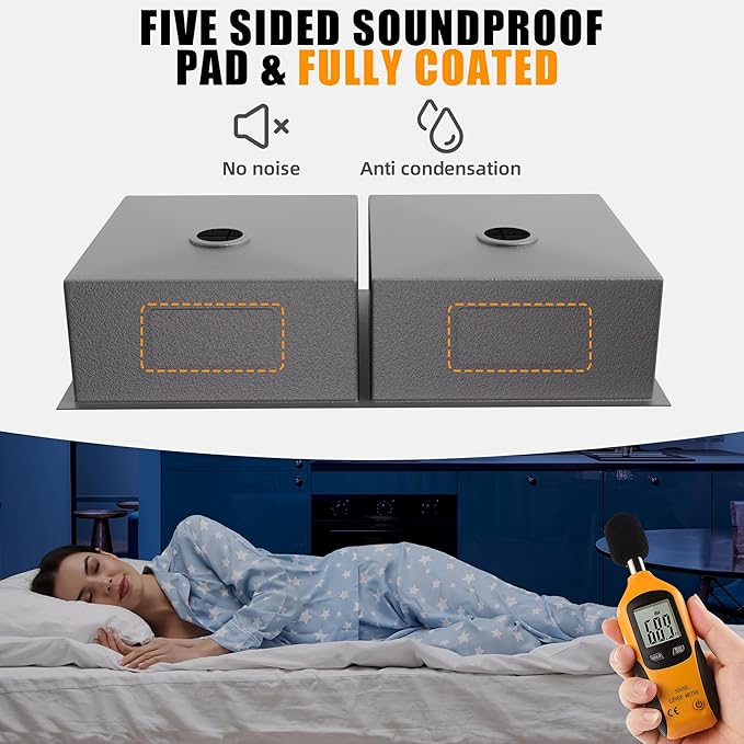 - 33 inch kitchen sink,double bowl black sink has thick noise-reducing mat to minimize water and impact sounds, keeping the kitchen quiet. The anti-condensation coating prevents water buildup, keeping cabinets dry. Perfect for busy cooking and daily cleaning.