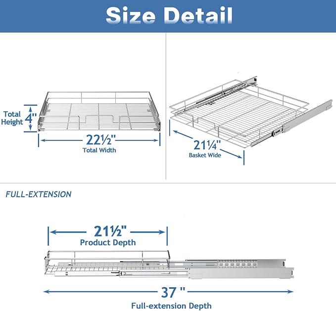 - 【Easy to Put Together and Install】 Our pull out cabinet organizer includes step by step instructions along with all of the hardware necessary for easy installation. Installs with just screw gun to drilled the holes follow the diagram install the rails, and then put the basket on the rails. Installation can be completed under 10 minutes.