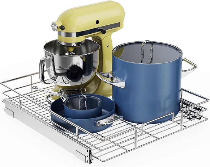 - 【Space-saving Pull Out Cabinet Organizer】This slide out cabinet organizer can maximize your cabinet space. Makes it super easy to store, organize, and access your stand mixers, pots, pans, baking sheets and other kitchen accessories, cleaning supplies, and various odds and ends. Now your cabinet is no longer just stacks of pots pans. You can contact seller via Amazon Messages to make sure if the size fit your cabinet.
