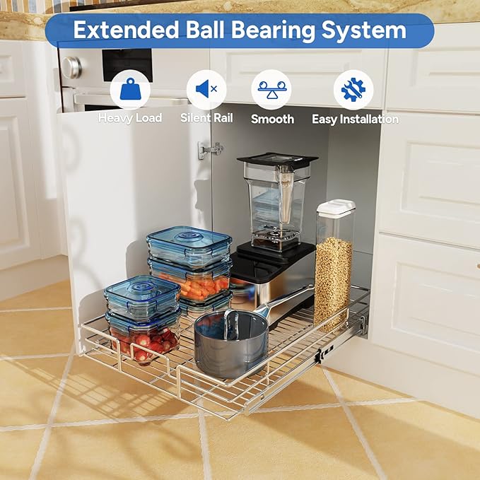 - 【Sturdy & Smooth Slide-out Drawer】 This pull out drawers for kitchen cabinets manufactured with a ball bearing system that slides out very smooth,heavy and sturdy. It conveniently slides out so you don’t have to dig way back in the cabinet when you are looking for what you need!