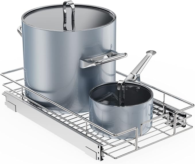 - 【Space-saving Pull Out Cabinet Organizer】This slide out cabinet organizer can maximize your cabinet space. Makes it super easy to store, organize, and access your stand mixers, pots, pans, baking sheets and other kitchen accessories, cleaning supplies, and various odds and ends. Now your cabinet is no longer just stacks of pots pans. You can contact seller via Amazon Messages to make sure if the size fit your cabinet.