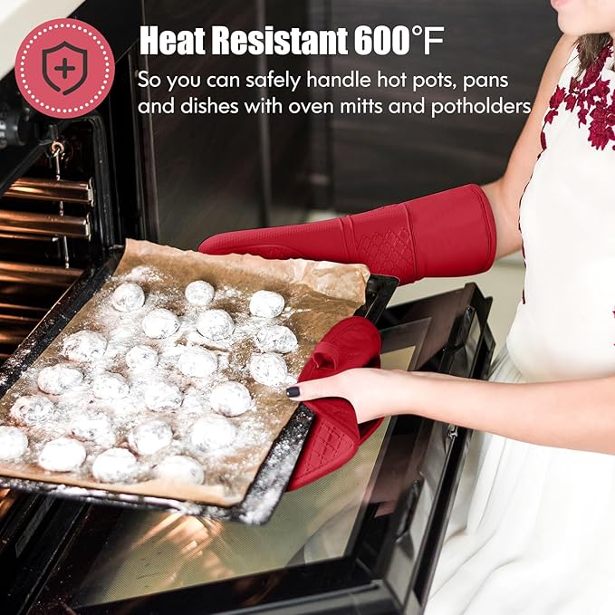 - Heat Resistant & Premium Material:The oven mitts and pot holders set consist of 2 layers of different material.The first layer is made of non-slip silicone and the oven mitt is heat resistant 600°F (315°C).The second layer of cotton is quilted to provide double protection