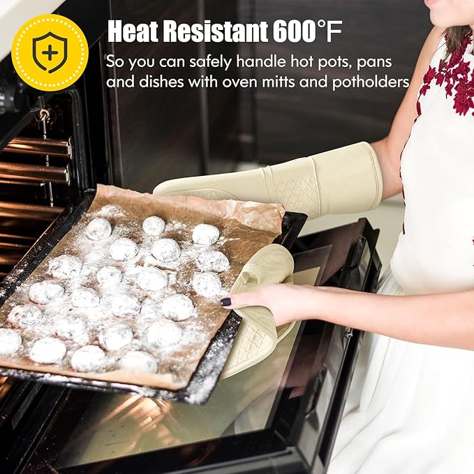 - Heat Resistant & Premium Material:The oven mitts and pot holders set consist of 2 layers of different material.The first layer is made of non-slip silicone and the oven mitt is heat resistant 600°F (315°C).The second layer of cotton is quilted to provide double protection