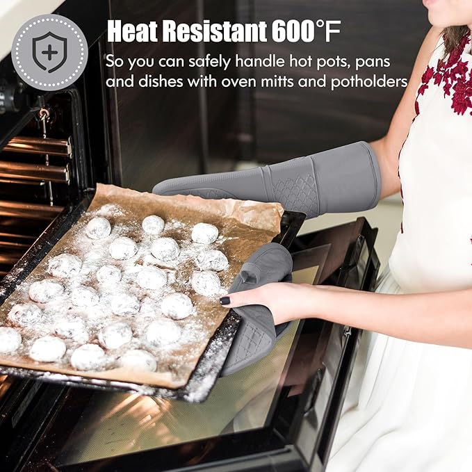 - Heat Resistant & Premium Material:The oven mitts and pot holders set consist of 2 layers of different material.The first layer is made of non-slip silicone and the oven mitt is heat resistant 600°F (315℃).The second layer of cotton is quilted to provide double protection