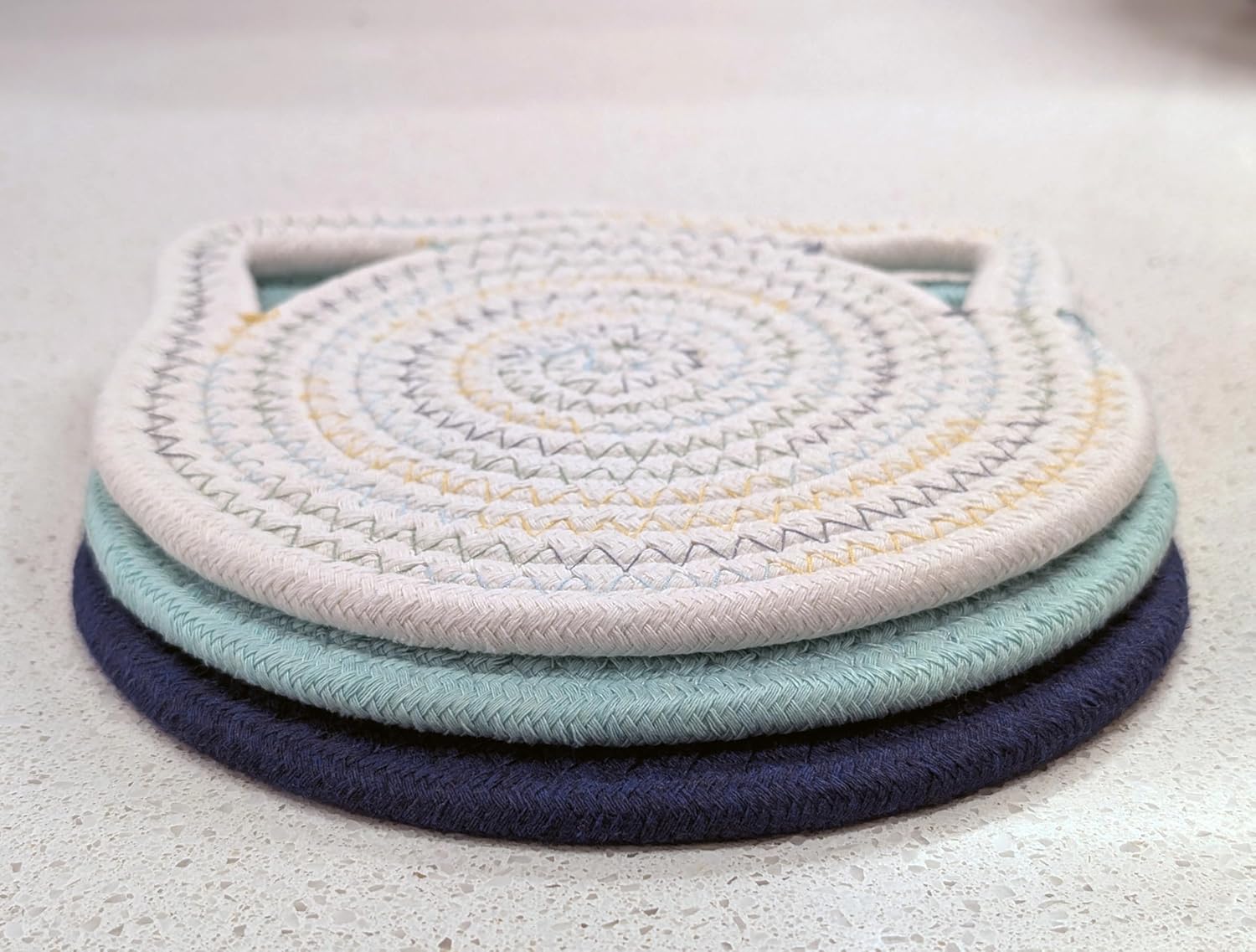 - Durable Materials: These trivets are made of woven cotton and are soft and flexible. Each trivet is about 7” in diameter and 0.3” thick.