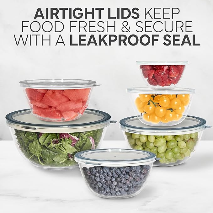 - Complete 12-Piece Set: Includes 6 glass mixing bowls with 6 ombre-colored, airtight lids – perfect for food storage, meal prep, and serving all in one. The set includes bowls with capacities of 26.72 oz, 36.85 oz, 53.25 oz, 70.67 oz, 92.66 oz, and 149.85 oz, all made from high borosilicate clear glass with colored lids.