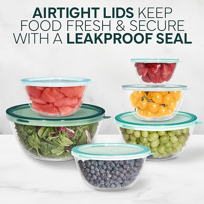 - Complete 12-Piece Set: Includes 6 glass mixing bowls with 6 ombre-colored, airtight lids – perfect for food storage, meal prep, and serving all in one. The set includes bowls with capacities of 26.72 oz, 36.85 oz, 53.25 oz, 70.67 oz, 92.66 oz, and 149.85 oz, all made from high borosilicate clear glass with colored lids.