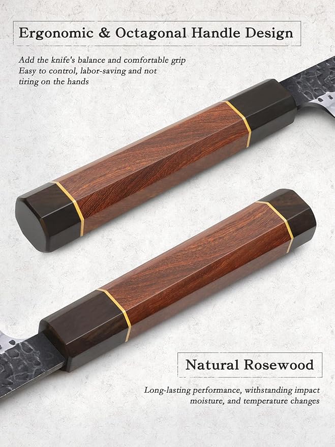 - 【Japanese Traditional Octagonal Handle】Ergonomically octagonal handle can provide a firm and safe grip and improve accuracy, ensuring reduced fatigue during extended kitchen sessions; High-quality rosewood combined with two copper wires embodies the details, which is both fashionable and noble