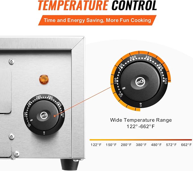 - Adjustable Temperature: With a 122-662℉/50-350℃ temperature range, our pizza oven allows you to precisely control the baking process and create perfect baked masterpieces. With just one-touch adjustment, you can perfectly control the cooking effect, and bake to perfection!