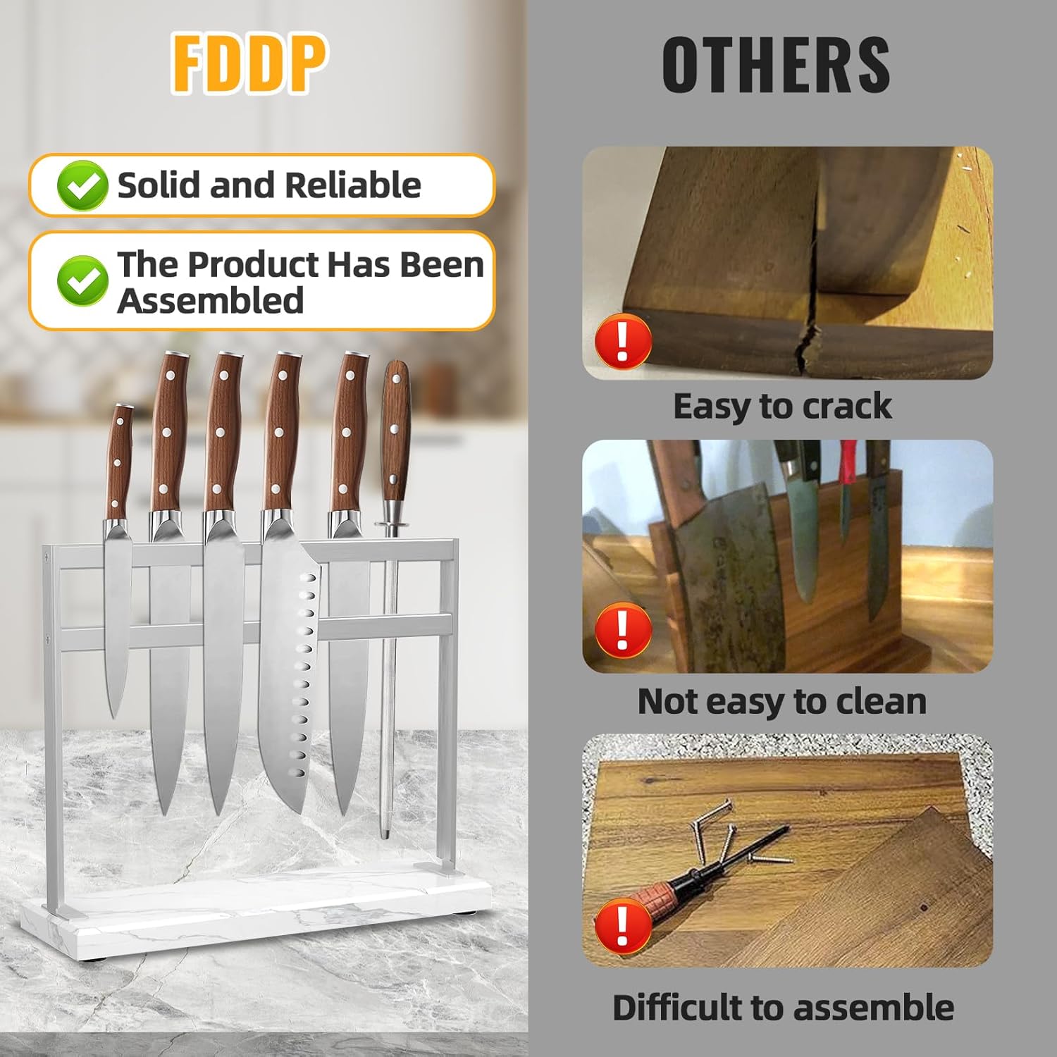 - 【Food-Grade Stainless Steel: Durable and Hygienic】 Made with high-quality food-grade stainless steel, this knife block is rust-resistant, easy to clean, and protects your knife blades from wear and tear. A quick wipe is all it takes to keep it spotless, ensuring a hygienic and long-lasting storage solution for your knives.