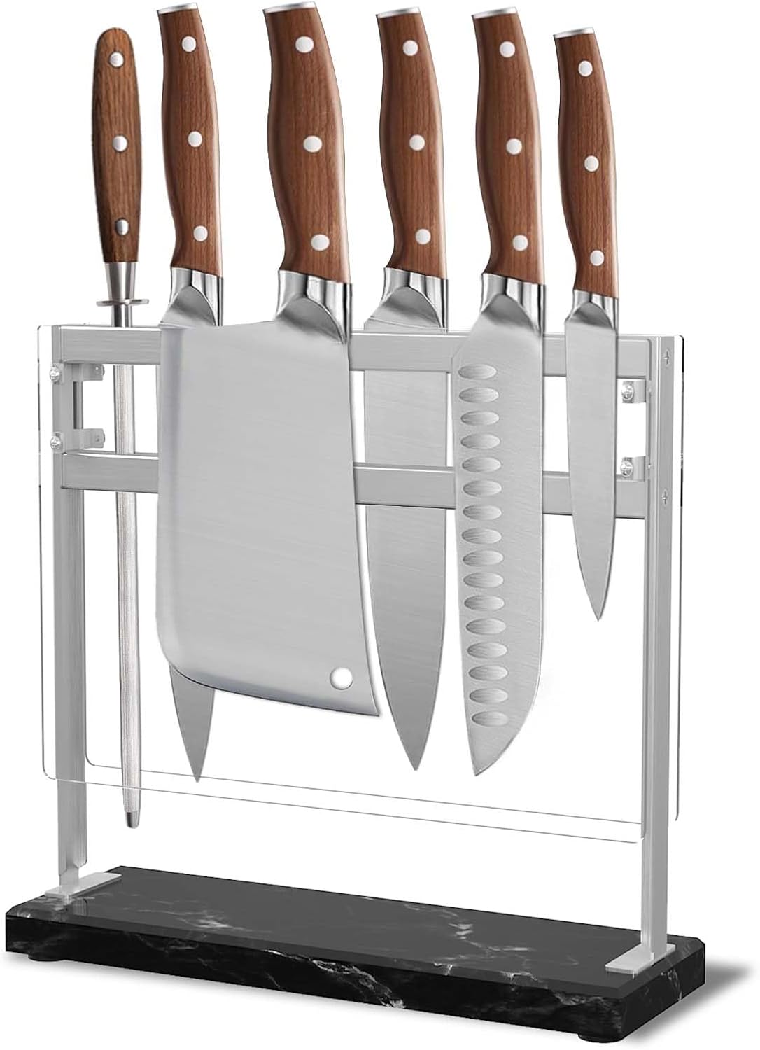 - 【Double-Sided Magnetic Knife Block: A Perfect Match for Modern Kitchens】 This double-sided magnetic knife block combines functionality with elegance, making it a perfect addition to any modern kitchen. Its sleek design pairs beautifully with marble countertops, creating a clean and stylish space that enhances your cooking experience. The double-sided magnetic surface securely holds multiple knives, maximizing your countertop space while keeping your kitchen organized and efficient.