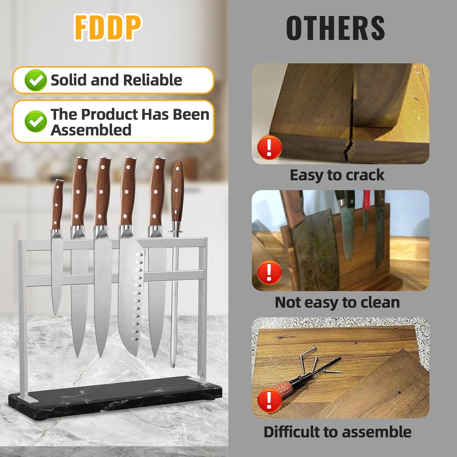 - 【Elegant and Stable Marble Base】 Crafted with a premium marble base, this knife block combines sophistication with stability. The smooth, non-porous surface resists stains and is easy to clean, maintaining a polished appearance that complements your modern kitchen. The sturdy base ensures the knife block remains steady during everyday use.