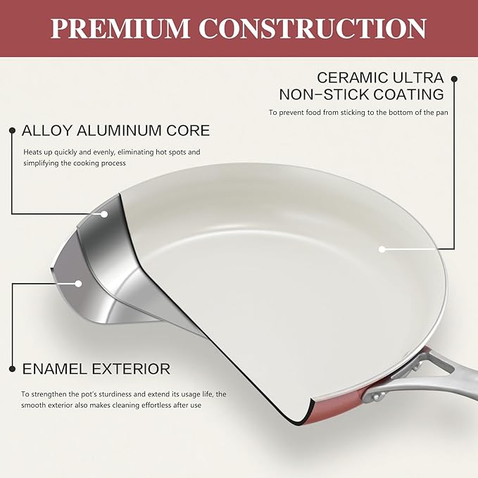 - Consistent Heat Distribution: The middle layer of our ceramic cookware is made from durable yet lightweight alloy aluminum. It heats up quickly and evenly, eliminating hot spots and simplifying the cooking process. Usage Tip: For best results, use low to medium heat. The inner ceramic coating and outer enamel material make cleanup a breeze after cooking