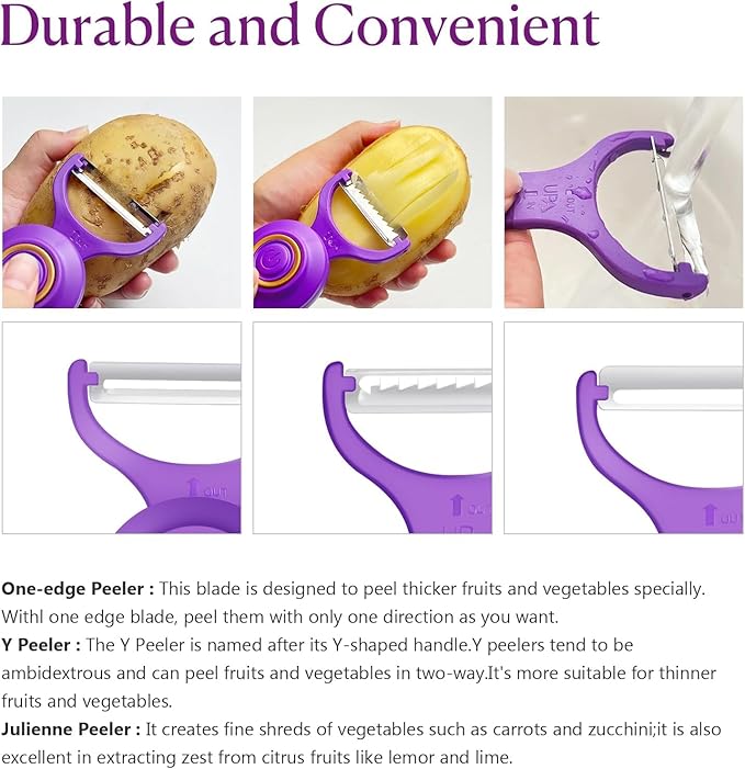 - 【Unique 3-in-1 set】Our fruit peeler comes with 3 premium stainless steel blades of the vegetable peeler to meet your all-purpose peeling task, it's non-toxic and the fine grinding of cutting mouth is more resistant to wear and tear.