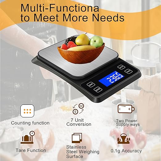 - Perfect Design : Backlit LCD screen with large fonts for easy reading, perfect fit for most kitchens, occupying little space and easily storable in cabinets, the weighing platform is made of stainless steel, easy to clean. There are 4 non-slip feet on the bottom to prevent slipping.