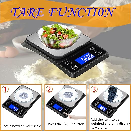 - Tare Function : Convenient tare button for tare calculation allows you to subtract the weight of plate or container, making it easy to achieve accurate readouts of ingredients. Our digital kitchen scale comes with auto and manual shut off function which can help you save battery life. The perfect scale for anyone looking to do intentional meal prep. Rejuvenate the look of your kitchen by adding this beautiful piece of technology to your home!