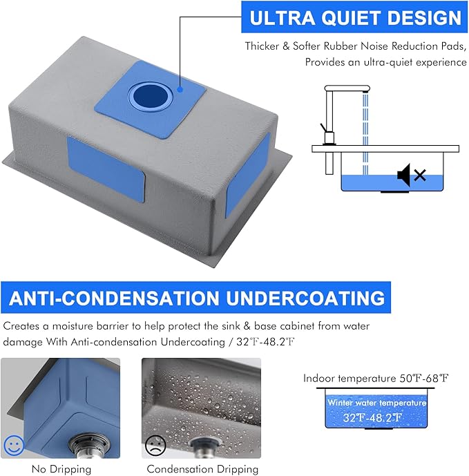- 【Sound Absorption】Featuring original Anti-Noise technology, this single bowl sink boasts a thick heavy-duty coating and extra-thick rubber padding, absorbing vibrations and noise from dishwashing and collisions