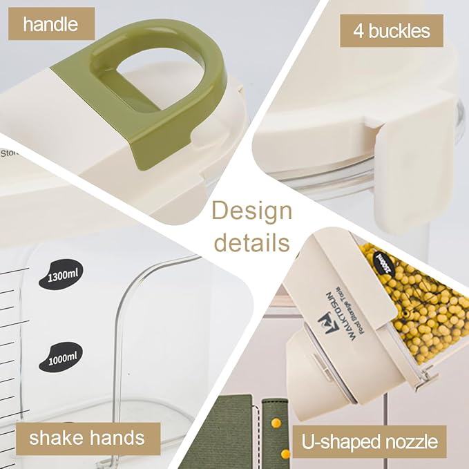 - 【Effortless Pouring & Smart Measuring】:Enjoy mess-free pouring with our wide spout and easy-to-grip ergonomic handle design. The visible clear 1300ml cereal dispenser features measurement markings for perfect portions every time. Bonus: The dust-proof lid doubles as a measuring cup! Say goodbye to spills and guesswork in your kitchen