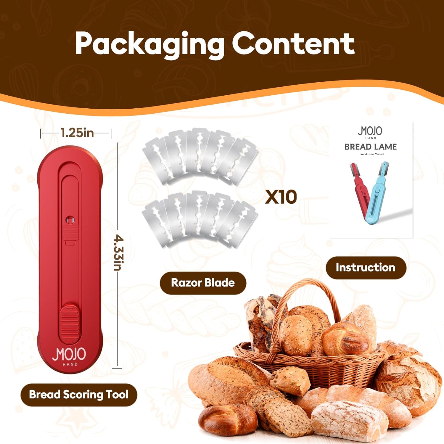 MOJOHAND Bread lame for Dough, Magnetic & Reusable Bread Lame Dough Scoring Tool, Anti-Slip Handle with Long Retractable Razor blades, Sourdough Scoring tool for Bread Making(Red)