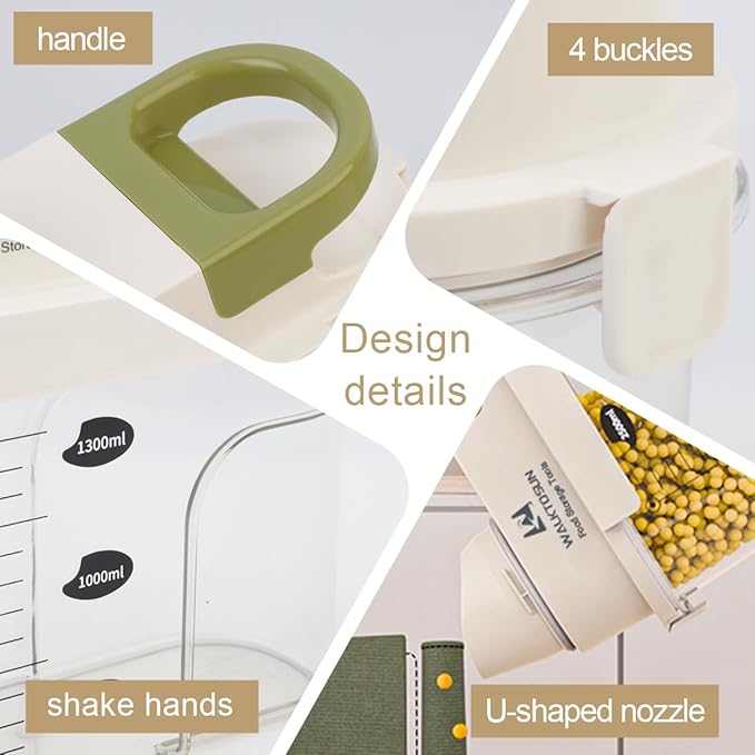 - 【Effortless Pouring & Smart Measuring】:Enjoy mess-free pouring with our wide spout and easy-to-grip ergonomic handle design. The visible clear 1300ml cereal dispenser features measurement markings for perfect portions every time. Bonus: The dust-proof lid doubles as a measuring cup! Say goodbye to spills and guesswork in your kitchen
