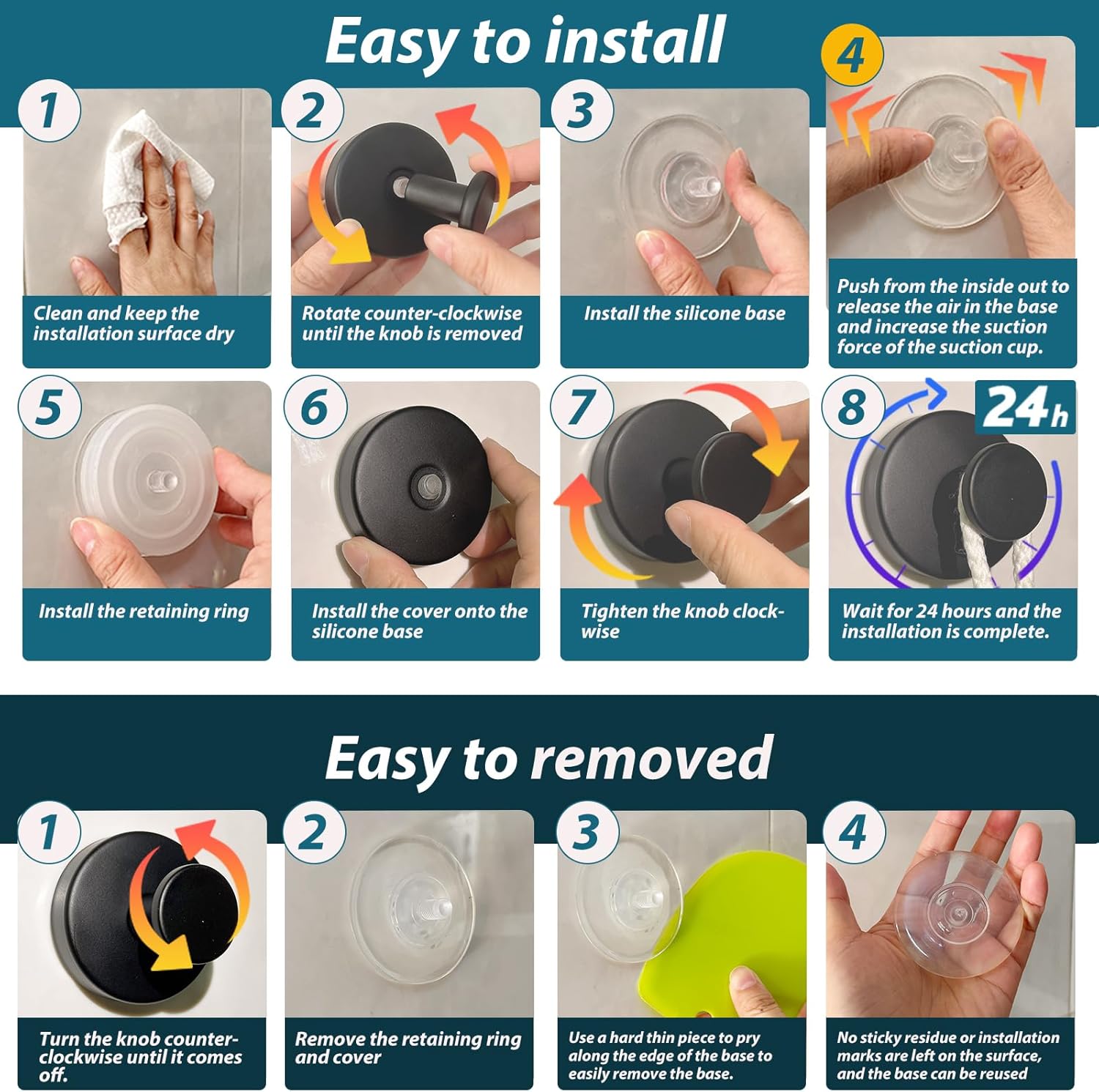 - 【Easy to Install and Use】 AbluFirst shower hooks do not damage walls during use. Just choose a smooth surface, twist and lock, and it’s done quickly. (Please refer to the instructions for detailed steps) The high-quality suction cup adhesive can be easily removed or repositioned without leaving sticky residue or installation marks.