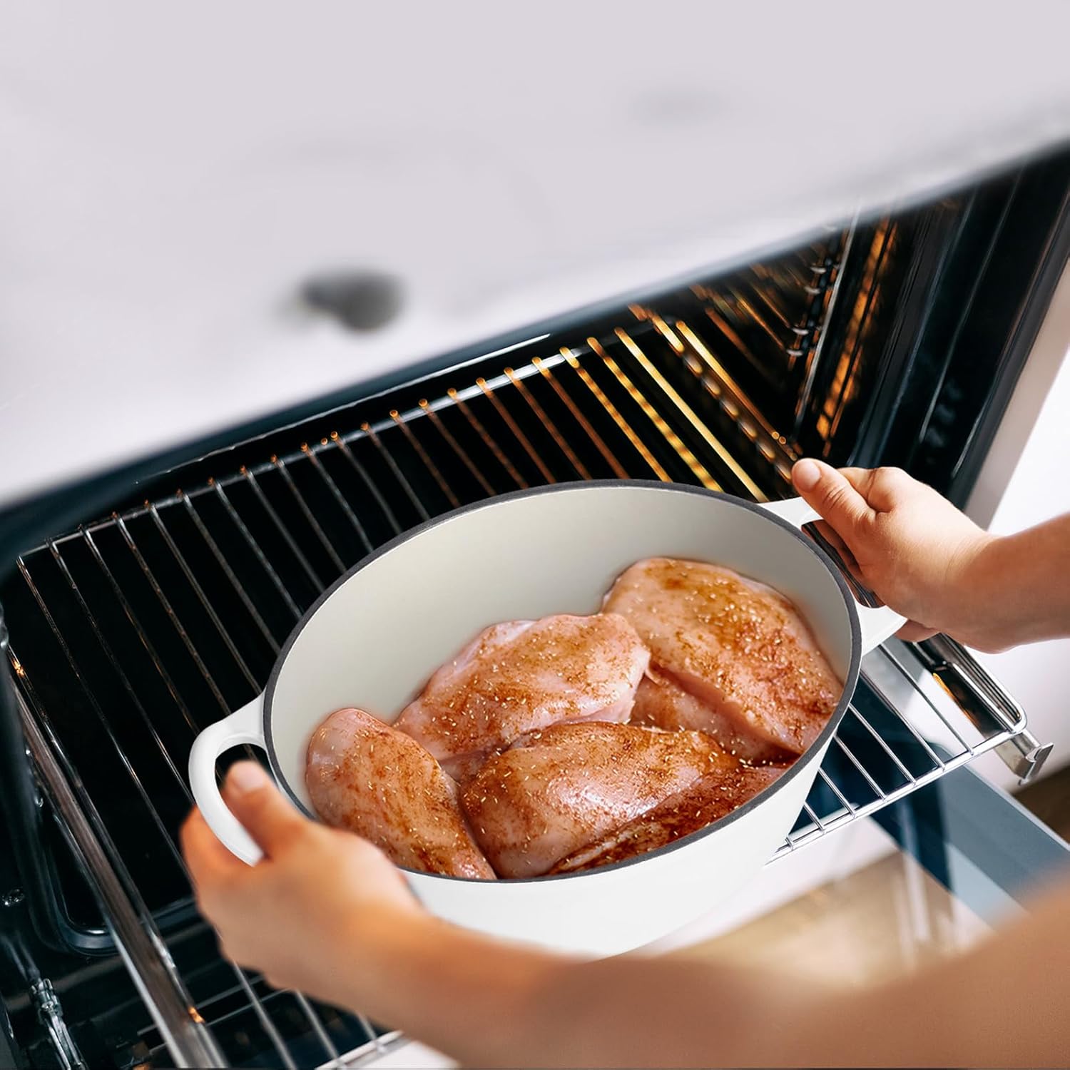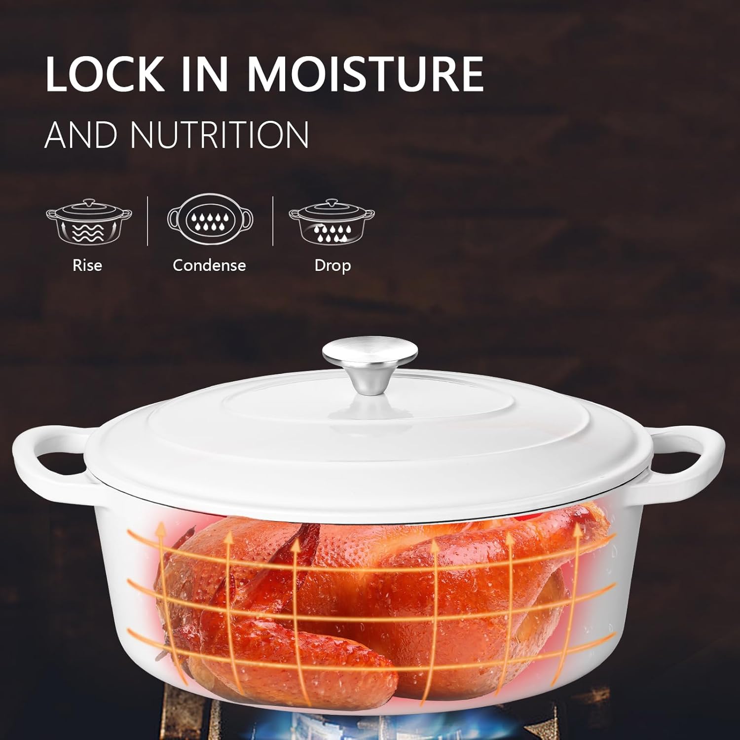 5QT Oval Dutch Oven Pot with Lid, Leonyo 5 Quart Enameled Oval Cast Iron Dutch Oven for Sourdough Bread Breaking, Heavy Duty Cookware for Braising, Stews, Roasting, White