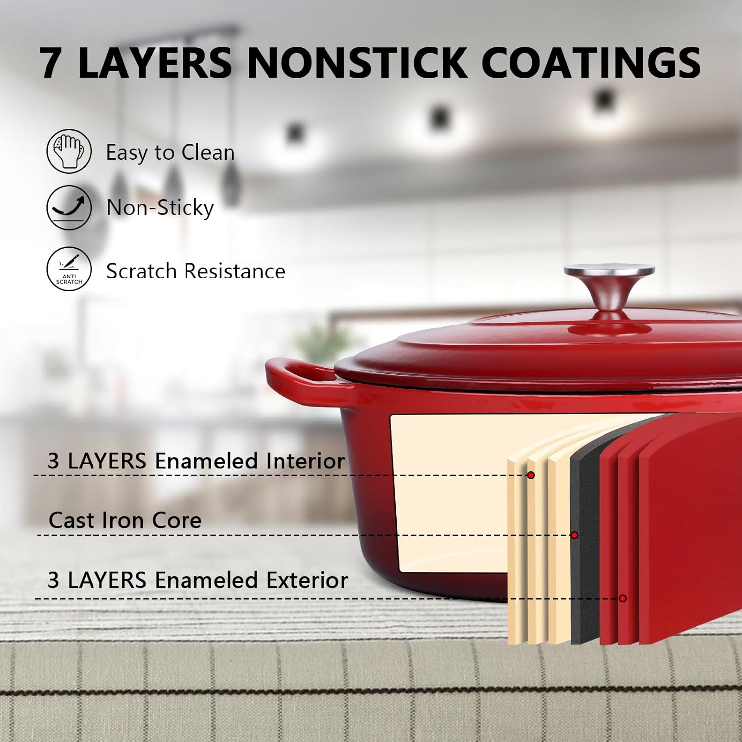 7 Quart Oval Dutch Oven with Lid, Leonyo 7QT Enameled Oval Cast Iron Dutch Oven for Sourdough Bread Breaking, Heavy Duty Cookware for Braising, Stews, Roasting, Red
