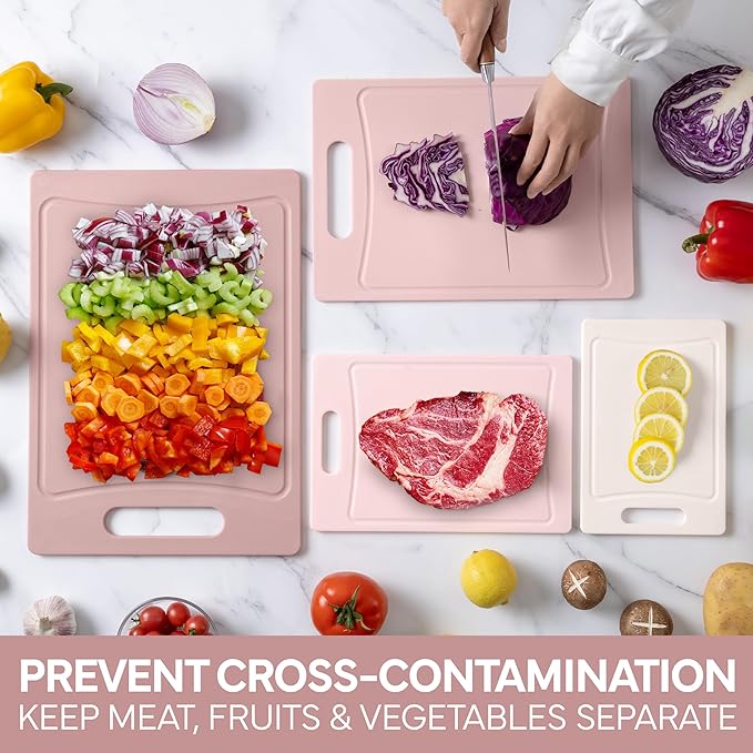 COOK WITH COLOR Non-Slip Cutting Board Set – Kitchen Essentials with Easy Grip Handle for Meat, Veggies, and Fruits, 4 Cutting Boards, Pink