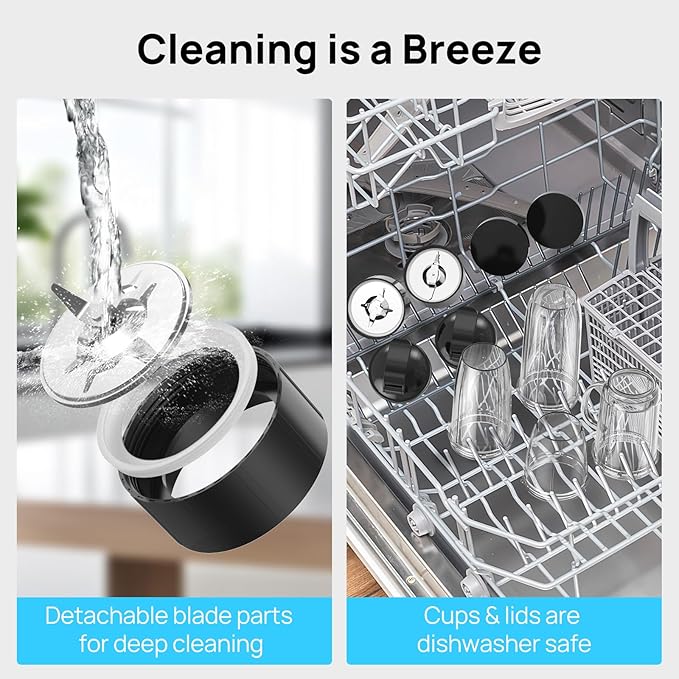 - 【Cleaning is a Breeze】 - With a drop of dish soap and some water, the blender can clean itself in seconds; Detachable blade parts for deep cleaning; Cups, lids, and blade assembly are dishwasher safe