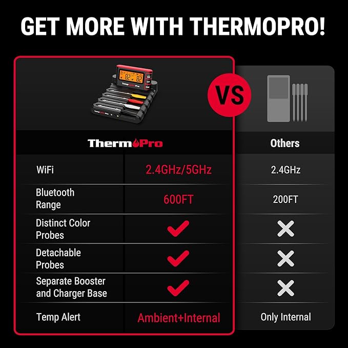 - 【More Stable Dual Connectivity】Combine unlimited range WiFi 5G/2.4G and 1060ft Bluetooth 5.2 connectivity, this meat thermometer digital wireless ensures higher stability at a longer range, seamlessly switching between kitchen cooking and outside grilling without losing track of your cooking process. Enjoy cooking anywhere!